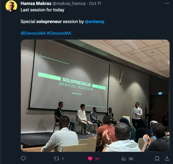 I think that’s what made people ask so many questions, the curiosity and the feeling that behind the fears was the possibility of freedom. I hope this will break silos even more in pure DevOps fashion, as Devoxx Morocco invested in this solopreneur session.